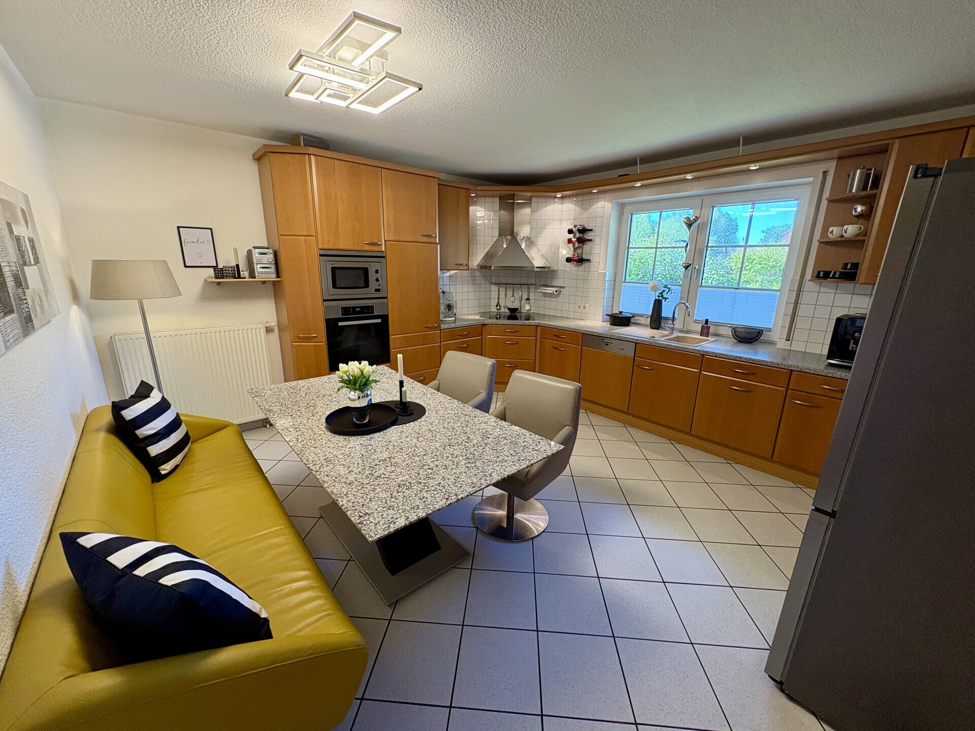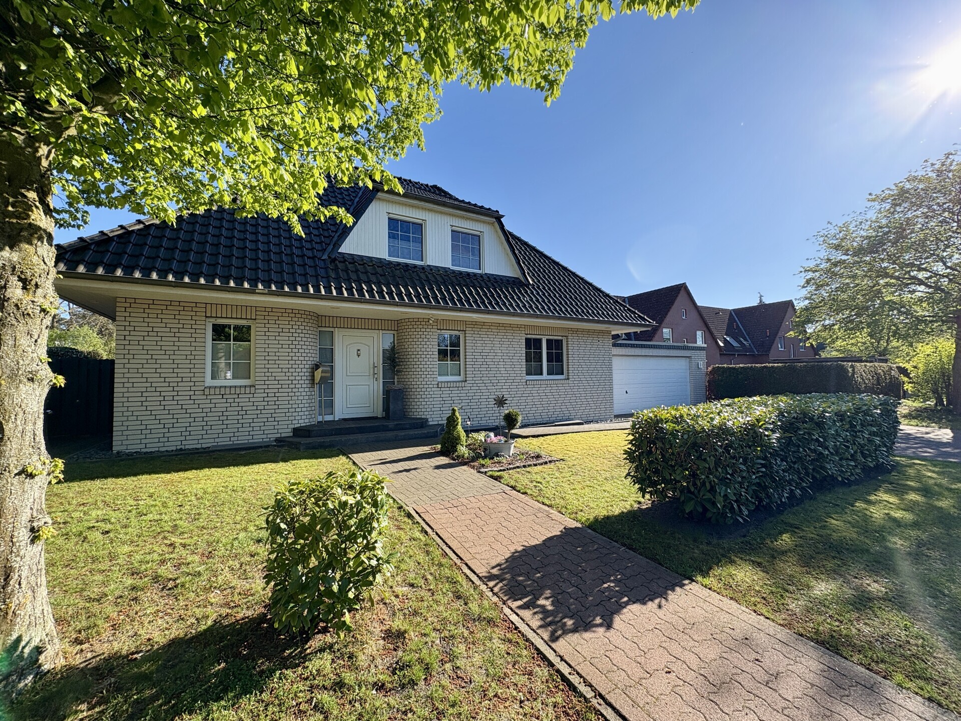 Dieses charmante, hochwertig errichtete Einfamilienhaus aus dem Baujahr 1997 ist ein echtes Zuhause für Familien, die Wert auf Raum, Qualität und ein sicheres Wohnumfeld legen. In ruhiger Spielstraßenlage gelegen, bietet es auf ca. 213 m² Wohnfläche und einem 715 m² großen Grundstück ideale Voraussetzungen für ein entspanntes Familienleben. Herzstück des Hauses ist der großzügige, offen gestaltete Wohn-/Essbereich mit Parkettboden, der durch seine Helligkeit und den direkten Zugang zur teilüberdachten Terrasse und dem weitläufigen Garten in sonniger Südausrichtung begeistert. Ein Wohlfühlort und zugleich ein Ort zum Abschalten für die ganze Familie. Ein einladender Eingangsbereich mit Garderobe, eine Küche mit praktischem Vorratsraum sowie ein Gäste-Bad mit Dusche runden das Erdgeschoss perfekt ab. Im Obergeschoss erwarten Sie zwei helle Kinderzimmer, ein Elternschlafzimmer sowie ein viertes Zimmer welches sich als Büro- oder Gästezimmer eignet. Das großzügige Bad mit Doppelwaschtisch, Eckbadewanne und Dusche bietet ausreichend Platz für den Familienalltag. Ein echtes Highlight ist der voll ausgebaute Keller: gefliest, gepflegt und vielseitig nutzbar – vom Hobbyraum bis zum Partykeller. Die Ausführung als „weiße Wanne“ (wasserundurchlässiger Stahlbeton auf halber Höhe des Kellers) sorgt zudem für einen besonders hochwertigen und abgedichteten Baukörper im Erbereich. Auch außen überzeugt das Haus mit viel Liebe zum Detail: weiße Klinkerfassade, schwarze Hochglanz-Dachziegel, Erker auf allen Hausseiten sowie große Dachüberstände mit integrierter Beleuchtung verleihen dem Haus einen besonderen Charakter. Die 2022 erneuerte Gas-Brennwertheizung (Fa. Brötje) und mit samt niedrigem Endenergieverbrauch von 60,25 kWh/(m²·a) stehen für nachhaltiges Wohnen auf hohem Niveau. Die Doppelgarage mit elektrischem Tor, direktem Haus-, Garten- und Kellerzugang rundet dieses attraktive Gesamtpaket ab.