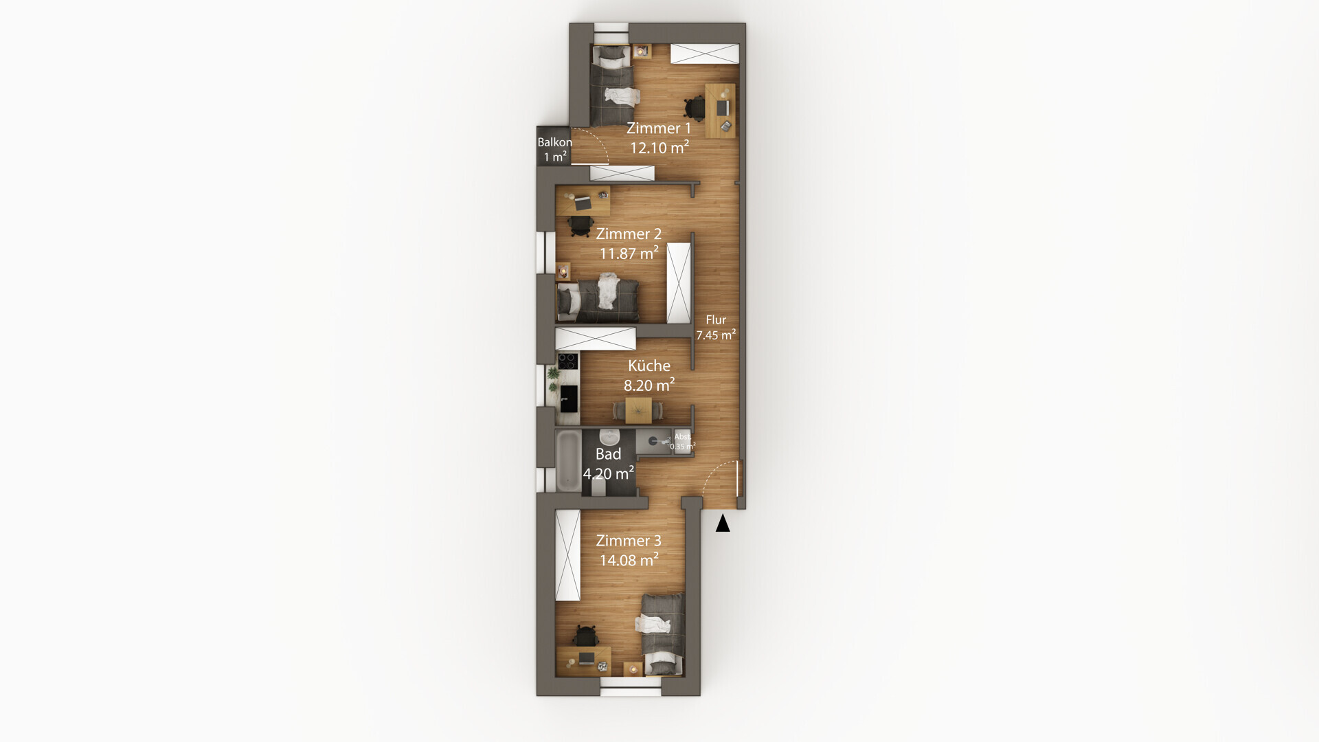 Alternativ kann die Wohnung als klassische 3-Zimmer-Wohnung für Paare oder kleine Familien gestaltet werden. Das Bad bietet Platz für Dusche und Badewanne, zusätzlich stehen Küche und Abstellraum zur Verfügung.