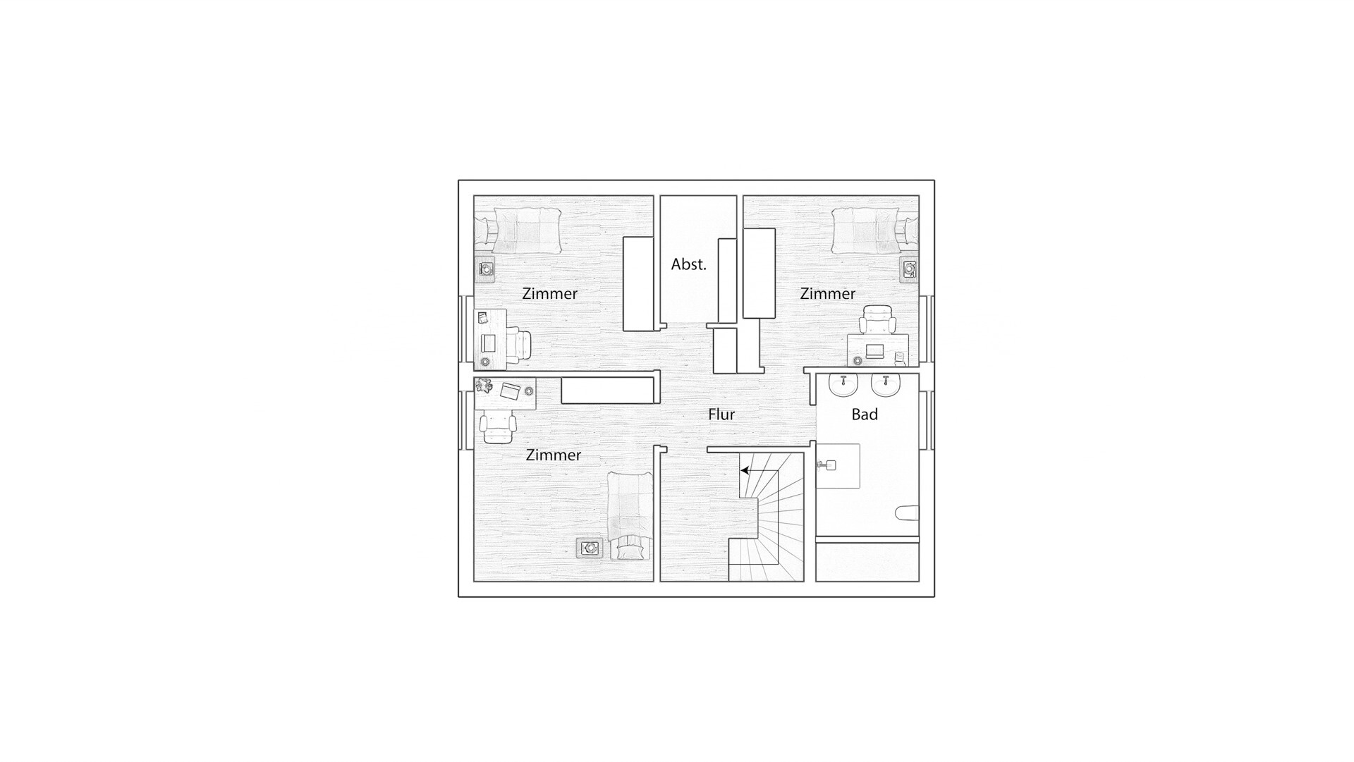 Im Obergeschoss befindet sich die drei gleichmäßig geschnittenen Kinderzimmer sowie ein weiteres, separates Bad.