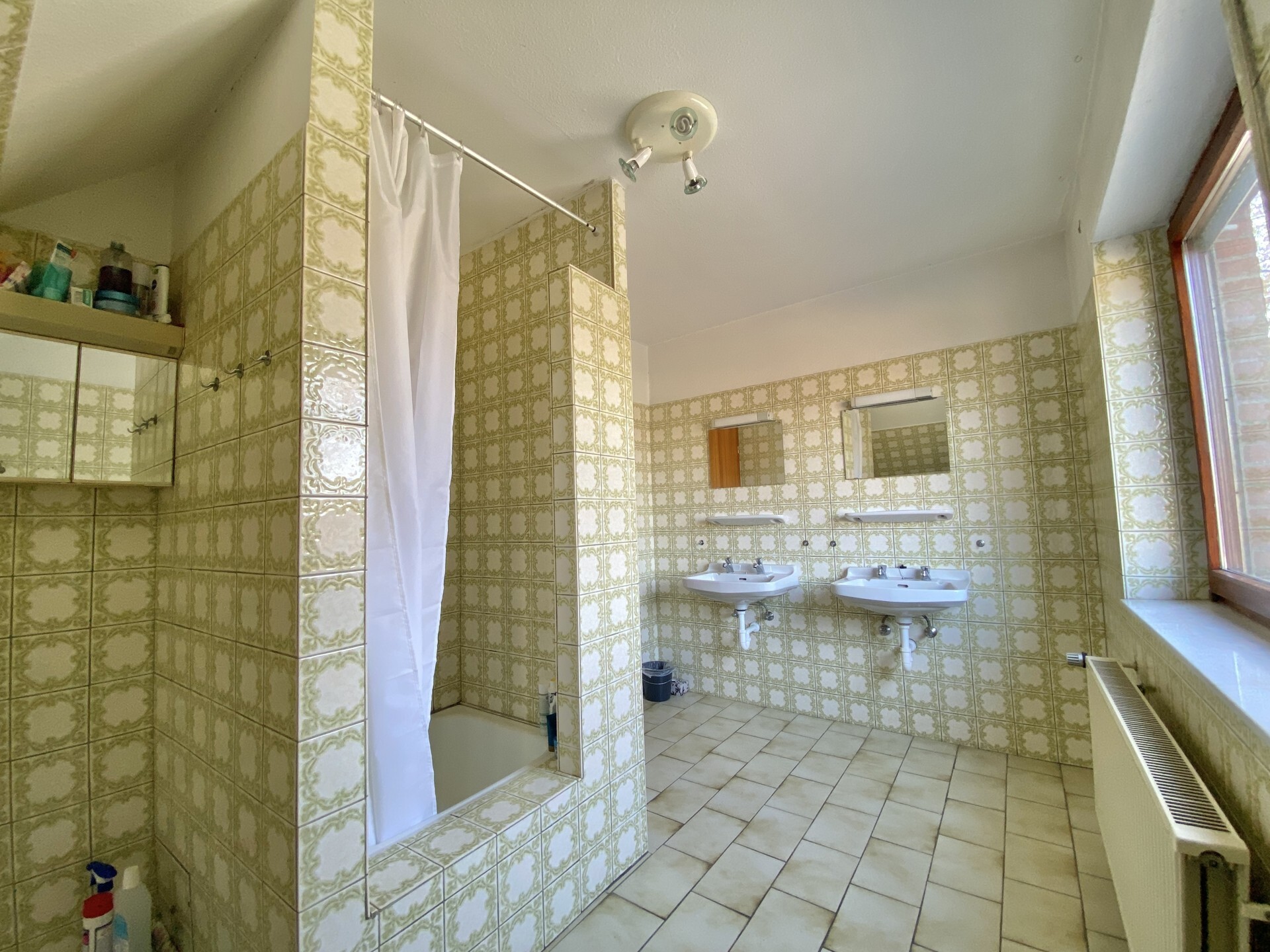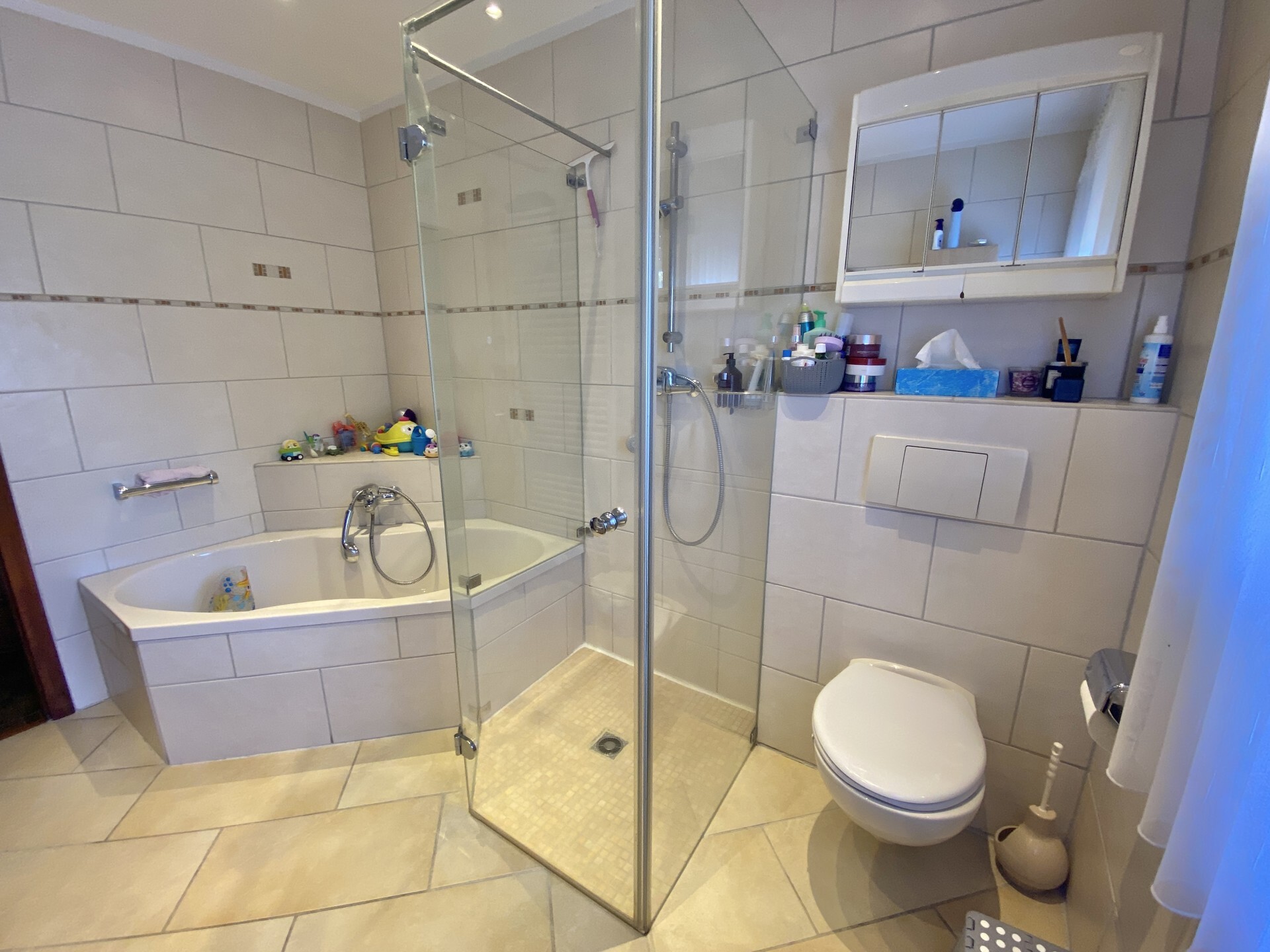 Das Bad im Erdgeschoss liegt unmittelbar gegenüber des Elternschlafzimmers, wurde im Jahr 2010 saniert und verfügt neben einer ebenerdigen Dusche auch über eine Eckbadewanne.