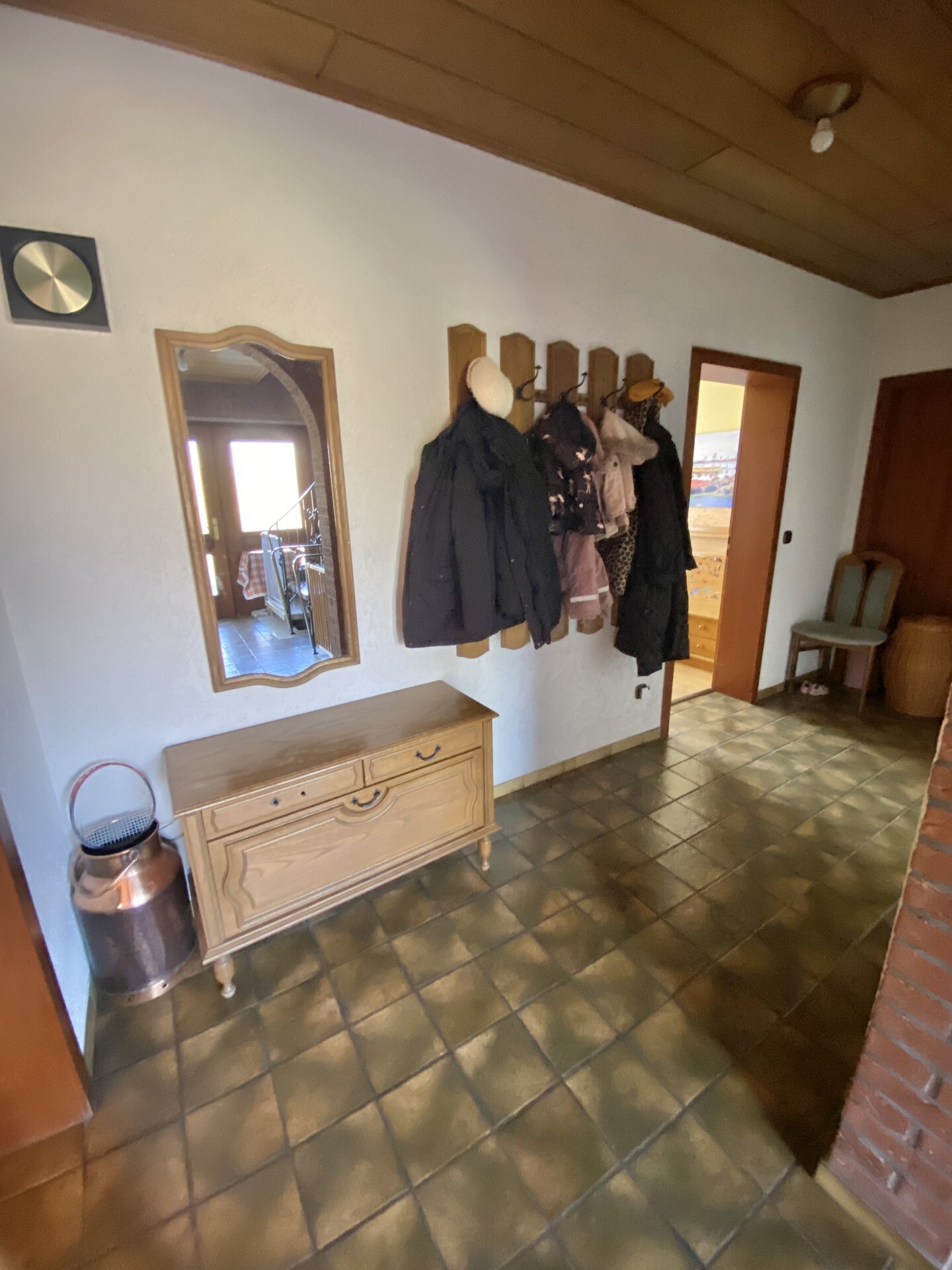 Der einladenden Eingangsbereich ist Fliesenbelegen gestaltet und hält ein separates WC samt kleiner Garderobenecke für Besucher des Hauses bereit.