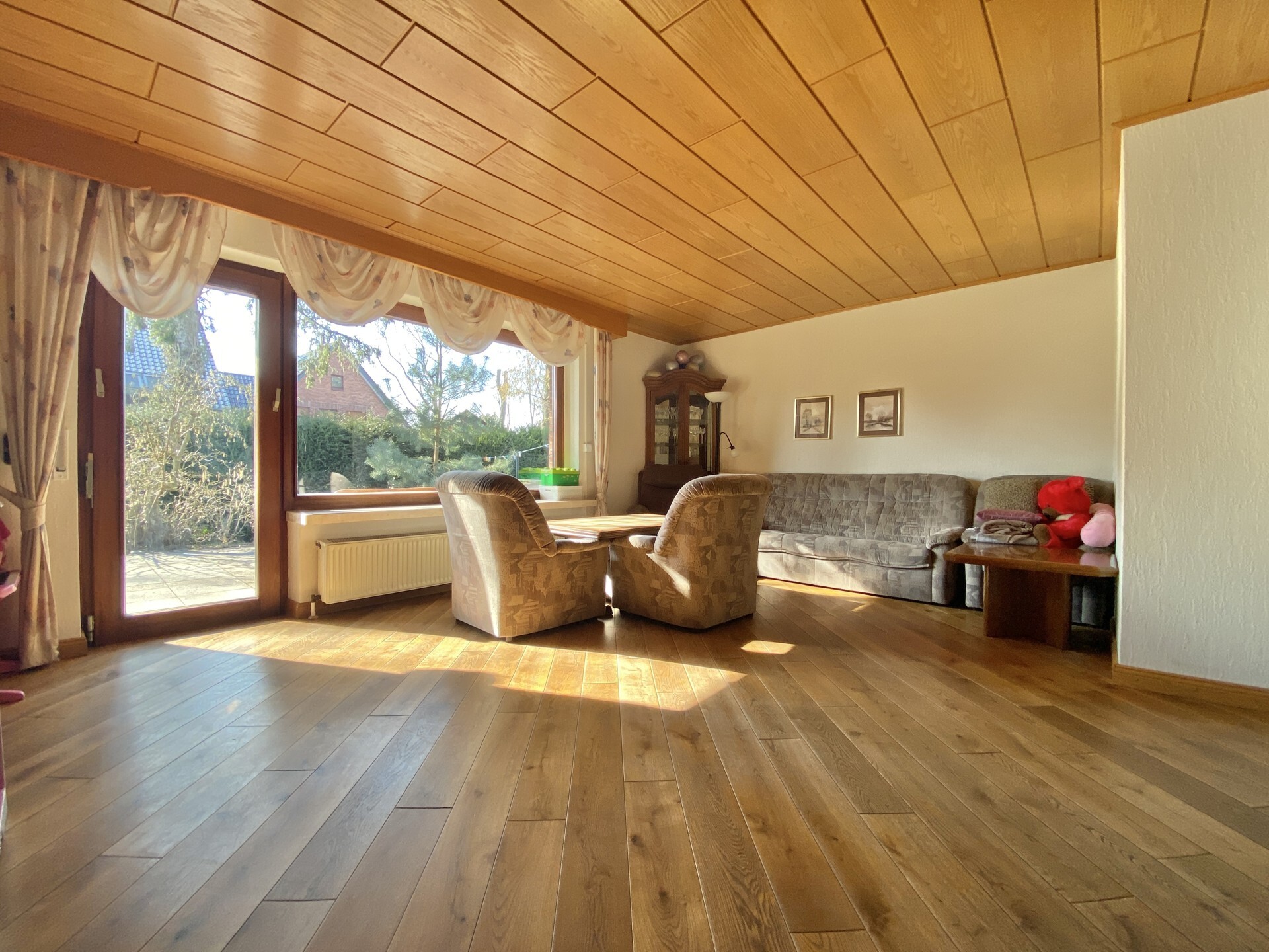 Über die großflächig angelegten Fensterelemente gelangt viel Licht in den gemütlich gestalten Wohnbereich, aus welchem sich ein Blick ins Grüne des Gartens des Einfamilienhauses bietet.