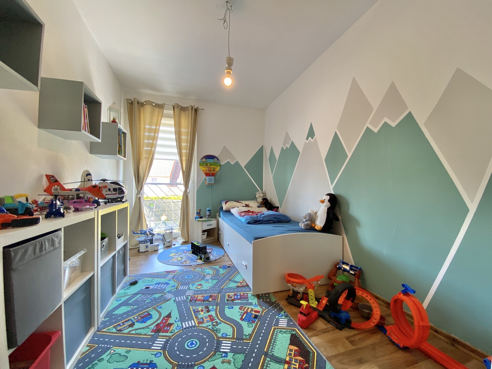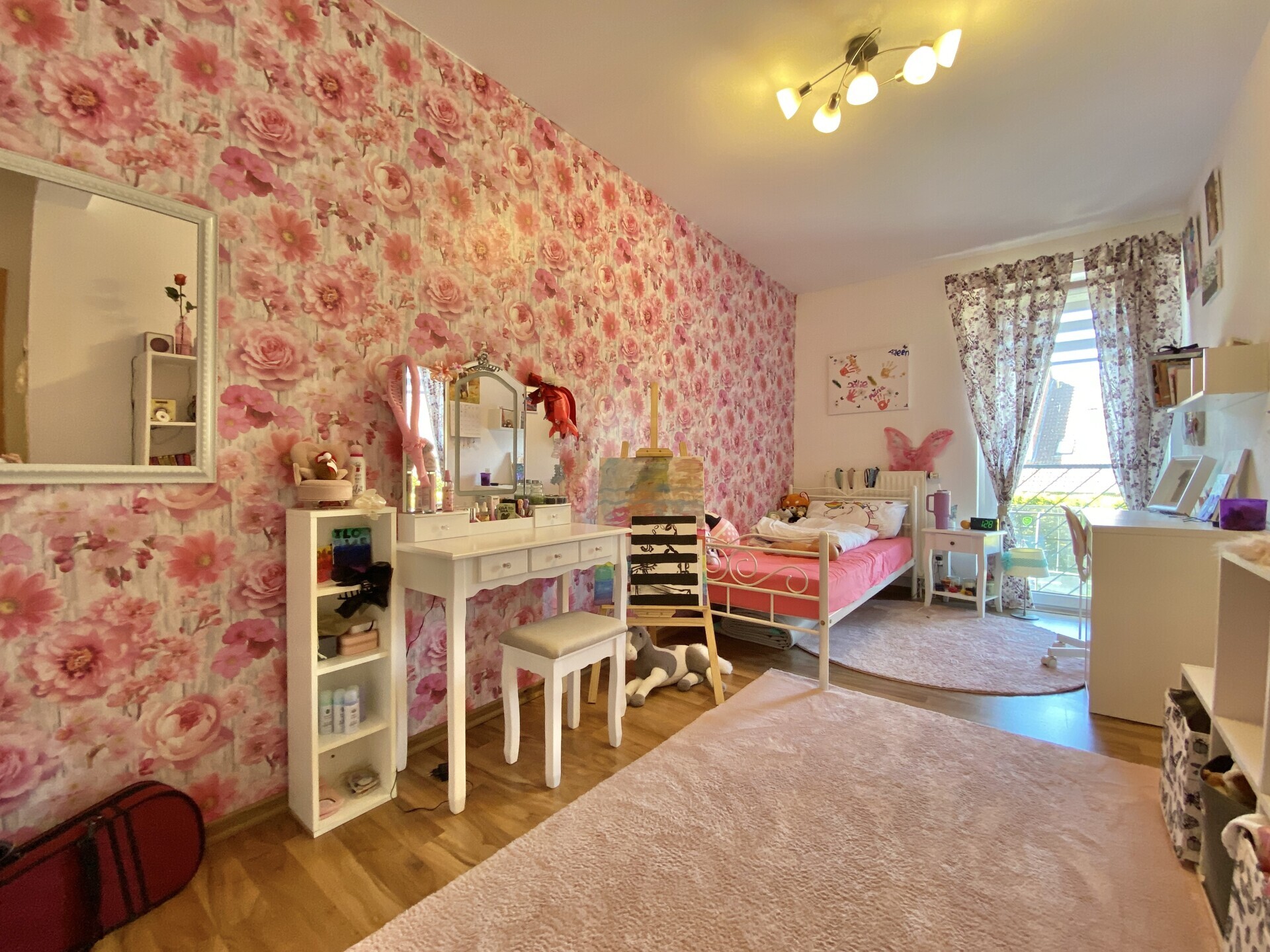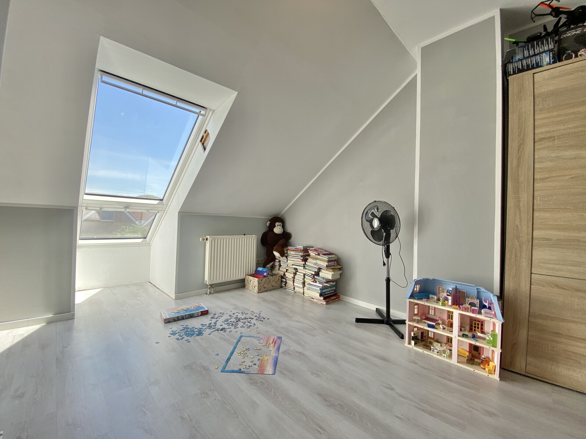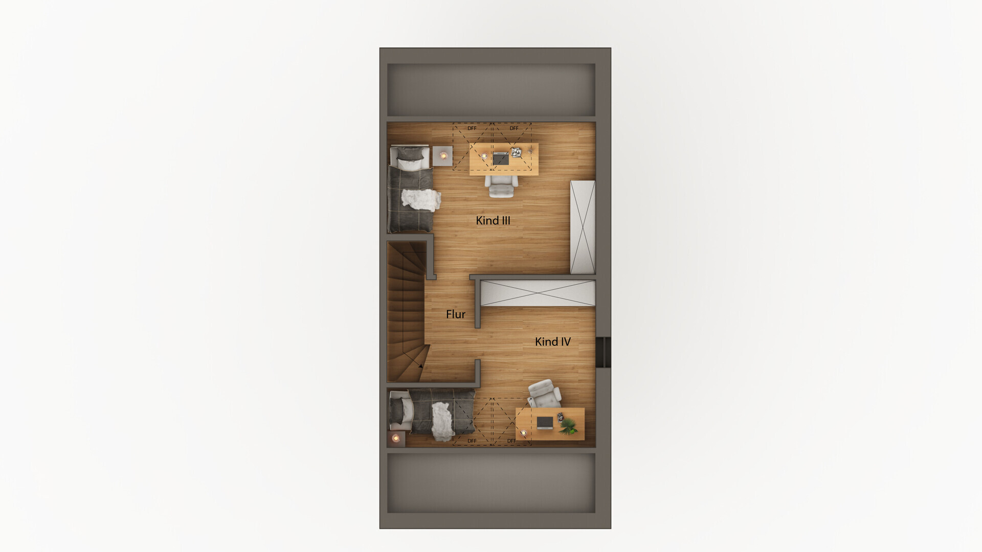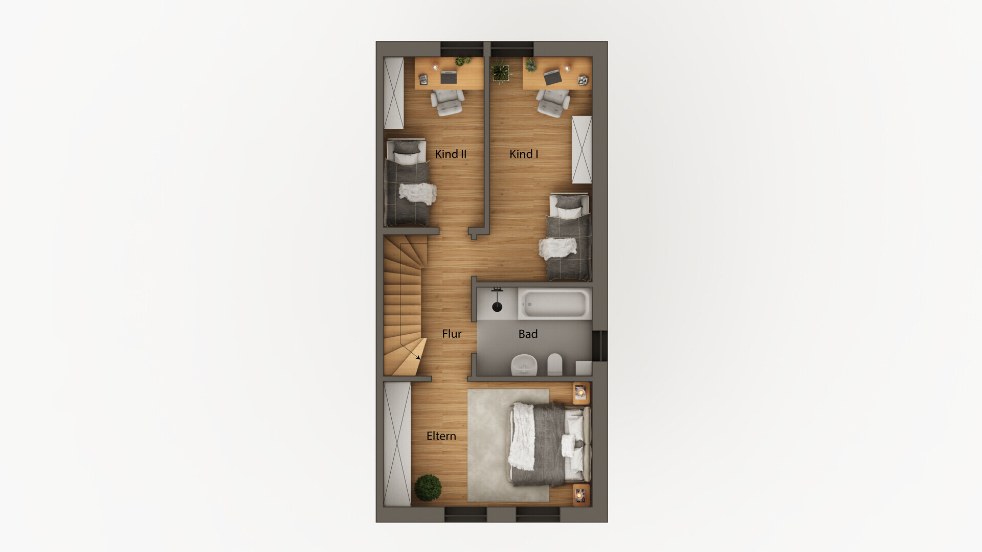Im Obergeschoss befinden sich das Elternschlafzimmer, zwei Kinderzimmer und ein großzügiges Bad mit Badewanne und Dusche. Das ausgebaute Dachgeschoss bietet zwei weitere, lichtdurchflutete Studiozimmer – ideal für größere Kinder oder als ruhiger Rückzugsort. Insgesamt stehen fünf Schlafzimmer zur Verfügung – selten in dieser Preisklasse.