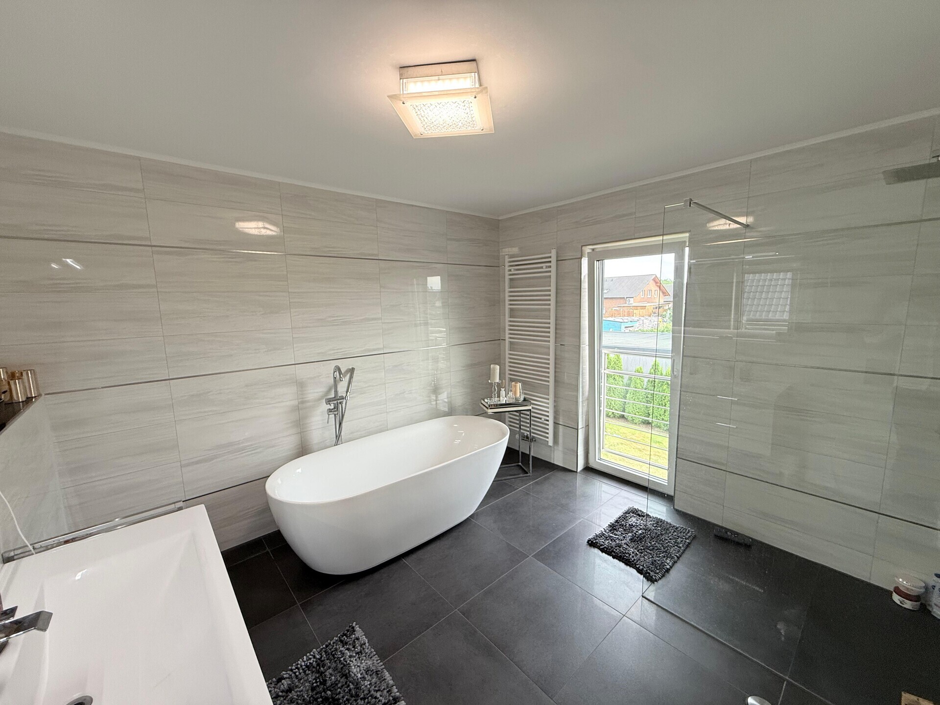 Ausstattungshighlights wie die durchgängige Fußbodenheizung, 3-fach verglaste Kunststofffenster (außen anthrazit), ein eleganter Materialmix aus dunklen Fliesen und grauem Vinylboden sowie die energieeffiziente Gaszentralheizung sorgen für Wohnkomfort und Langlebigkeit. Die Fassade ist mit einem Wärmedämmverbundsystem versehen und hell verputzt, ergänzt durch schwarze Dachziegel und großzügige Dachüberstände mit integrierten LED-Spots.