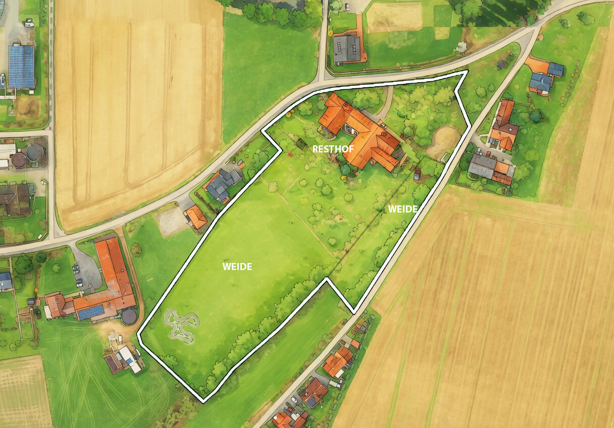 - Zwei große Weide-/Grünflächen (>3.500 m² & >10.000 m²) – ideal für Pferdehaltung
